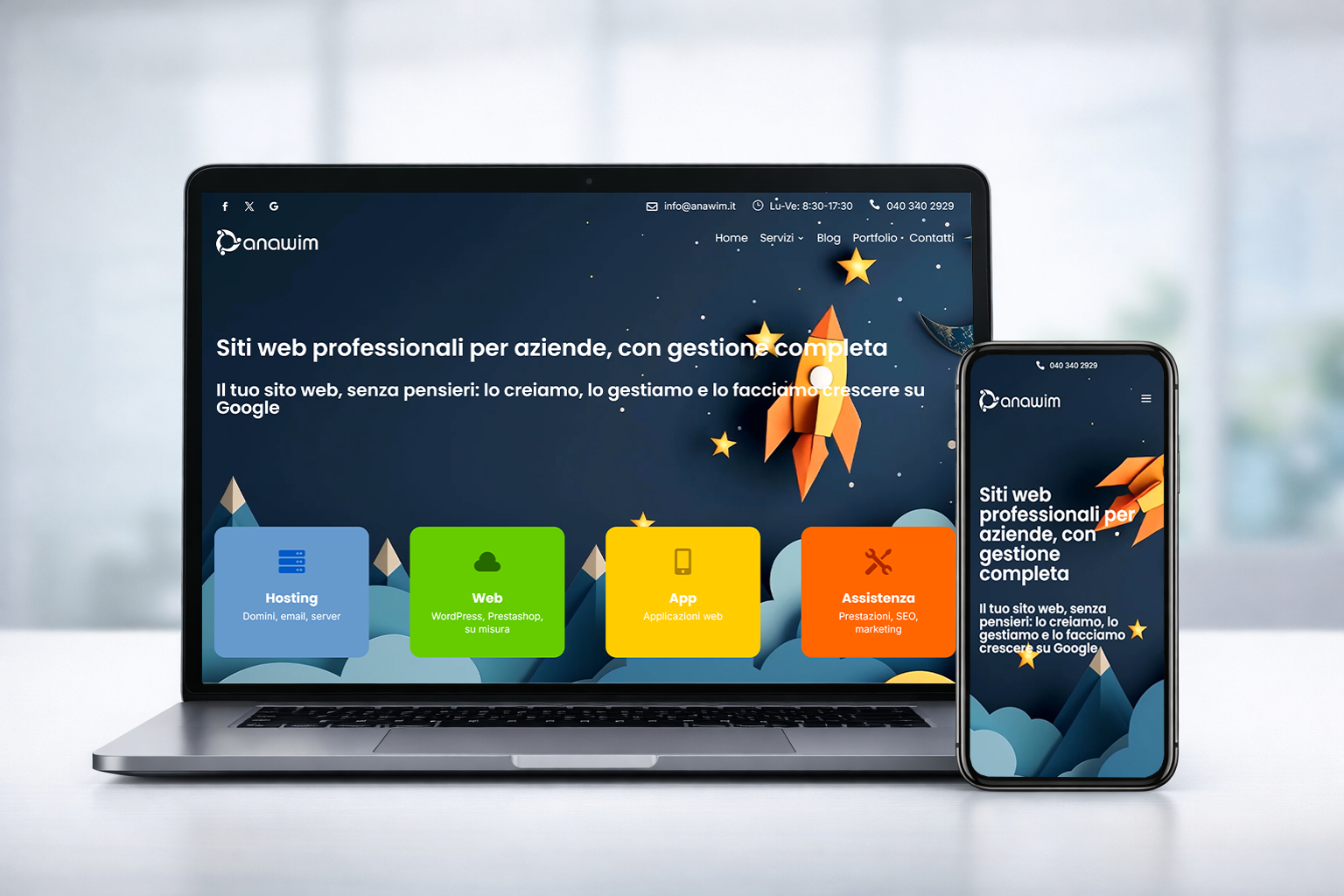 Pubblichiamo il sito e ci occupiamo della gestione tecnica nel tempo, così non devi preoccuparti di nulla.